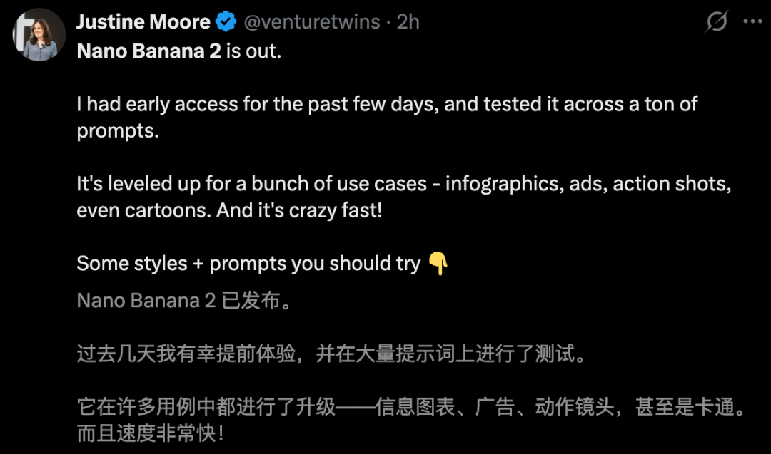 a16z合伙人Justine Moore测试中发现,NB2在信息图表、广告、动作镜头,甚至是卡通生成实力提升,且速度非常快。