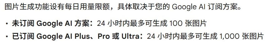 未订阅Google AI方案的用户,24小时内最多可生成100张图片;已订阅Google AI Plus、Pro或Ultra的用户,这个上限提升到1,000张。