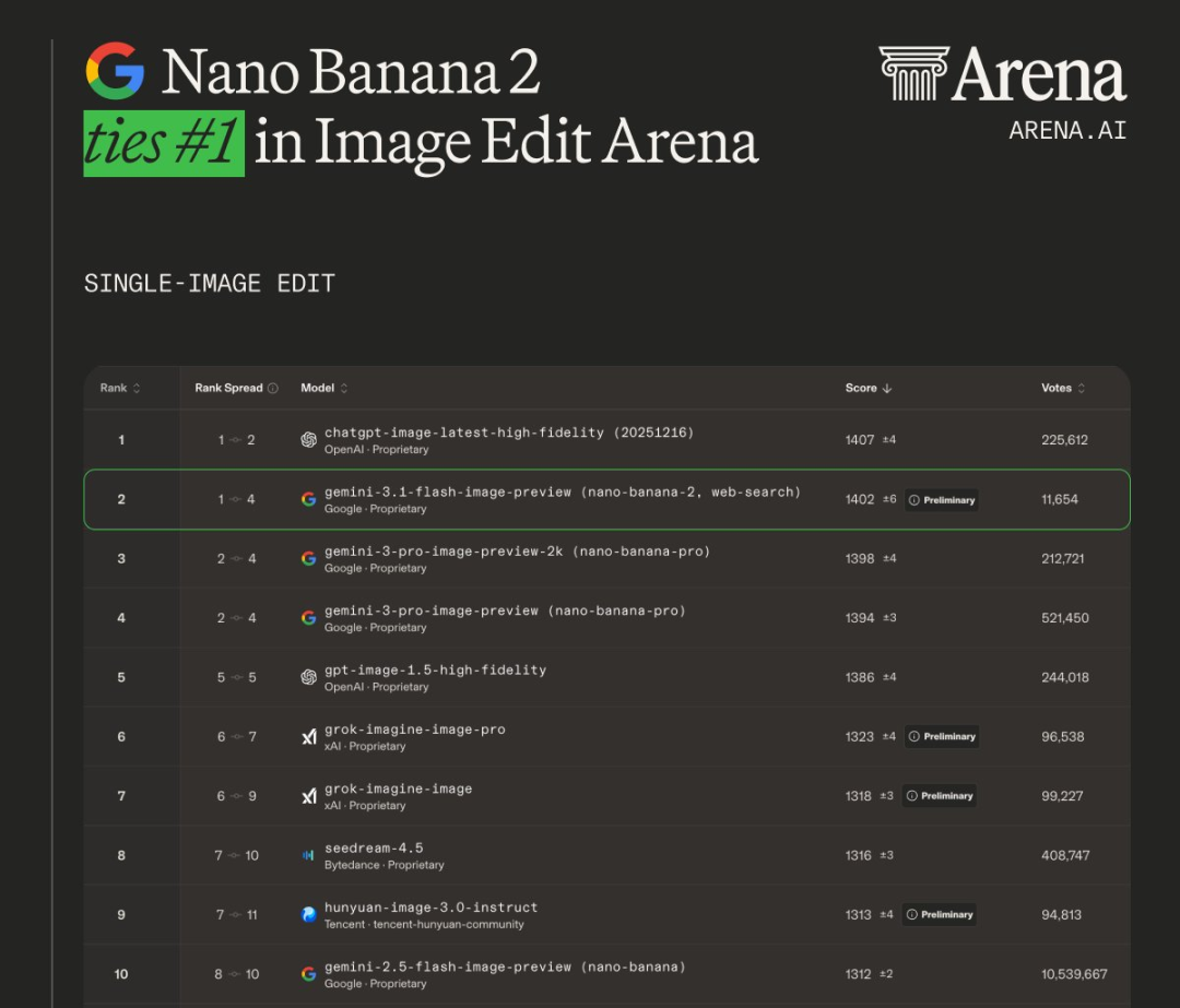 在Image Arena中,NB2文生图同样问鼎榜首,斩获1279 Elo得分,图像编辑实力仅次于GPT Image。