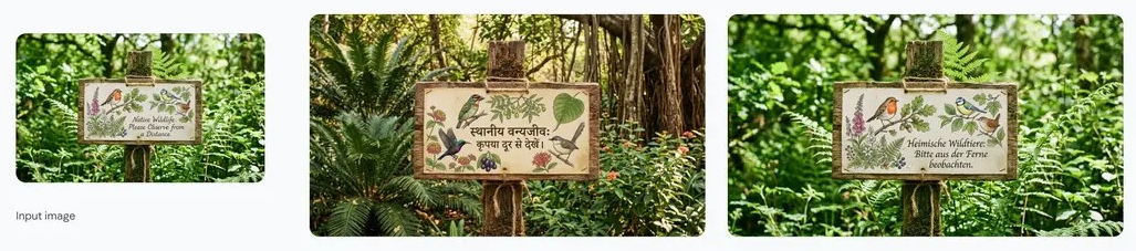 第二张则是一句话就完成了场景本地化——把整个概念转换成印度场景,所有文字翻译成印地语,连植被、光线氛围都做了相应调整。这种「一键本地化」的能力,对做全球化内容的创作者来说太实用了。