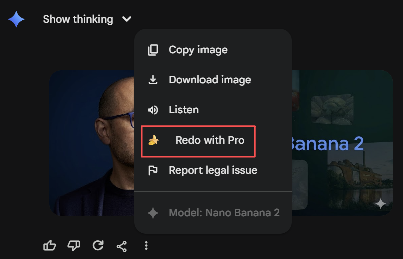 Nano Banana 2将在Fast、Thinking和Pro模型中全面取代Nano Banana Pro,想要「顶配」的用户依然可以通过三点菜单选择「重新生成图像」来切换回Nano Banana Pro。