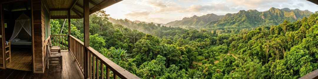 第一张是一个充满自然气息的电影级特写,展现了一块由回收环保材料制成的精美指示牌,上面画着当地的鸟类和花卉,牌子下方用优雅的手写字体写着「原生野生动物:请保持距离观赏」。柔和的漫射光透过旁边蕨类植物的叶片洒下,背景是生机勃勃的绿色植物虚化效果。