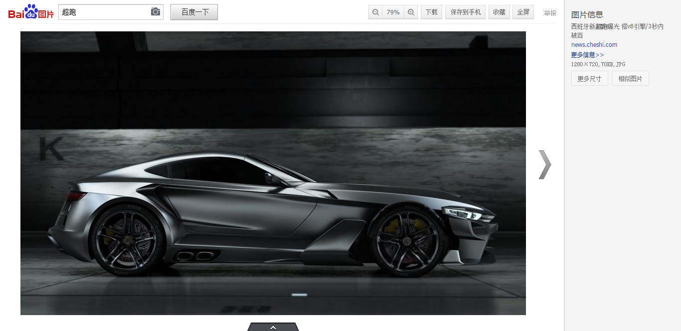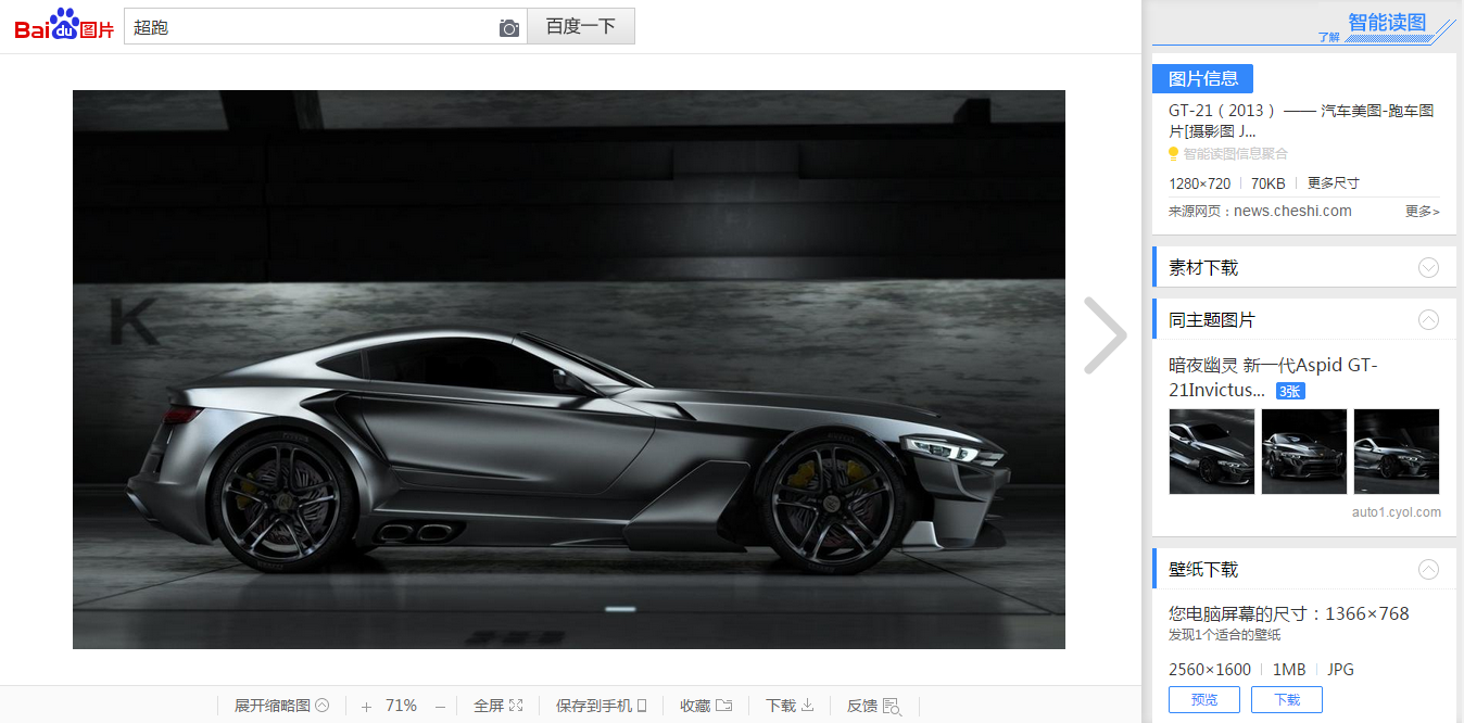原来,在新版百度图片中,搜索结果将不仅仅是一张图片,而是呈现出更多图片的相关信息与服务。比如,在搜索“超跑”时,除了搜索到的图片外,搜索结果只有最基本的图片信息,而“智能读图”通过人工智能技术,识别图片中的内容、提供相关的网络信息,根据对用户需求的判断,触发百科卡片、相似风格图片甚至壁纸下载、高清版本等服务。