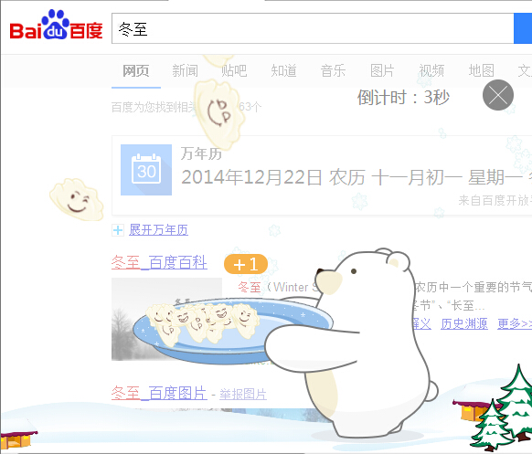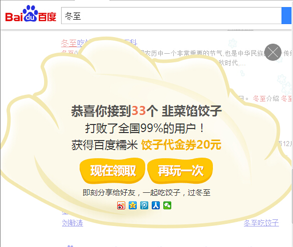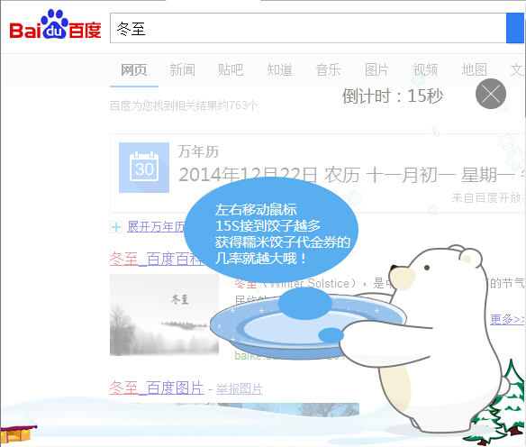 百度搜索“冬至”,出现的是移动鼠标接饺子赢糯米网优惠券的活动,非常给力,让小白吓了一跳!不信你试试(技巧是把浏览器缩到最小,这样就可以接住所有的饺子啦!表告诉别人哦!):