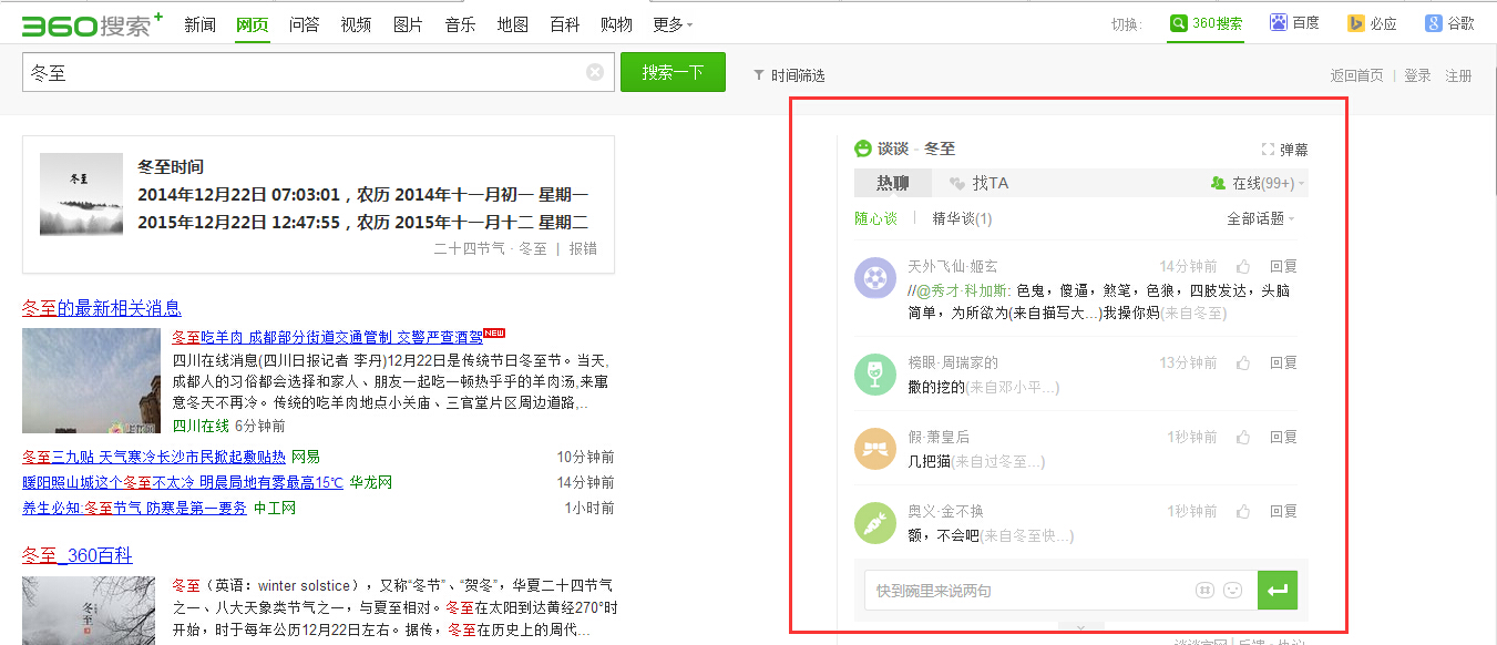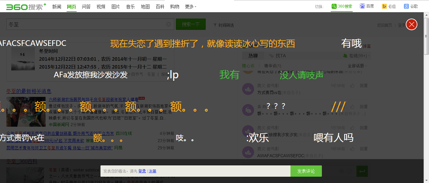 360搜索“冬至”,提供的是相互交流的平台,还有弹幕功能哦!(不过好像搜索什么都有这个功能哦!)