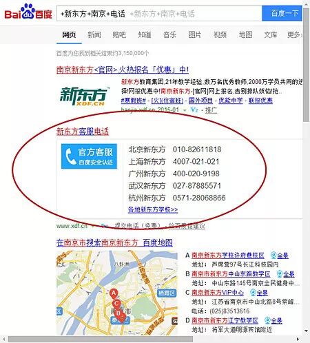 举个栗子:在百度搜索引擎中输入“+新东方+南京+电话”就表示要查找的网页内容中必须同时包含“新东方、南京、电话”这三个关键词。看下面的图,很容易就找到你想要的结果了: