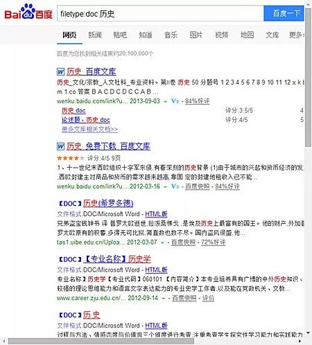 在百度中搜索专业文档呢?在你的关键词前面加上“filetype:doc”就可以!