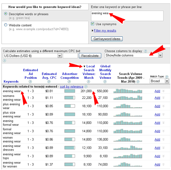 google公司提供的关键词工具能够帮你了解到当前在google搜索结果中与你产品有关的最热的关键词,我之前使用过''evening wear"(晚礼服)这个关键词,搜索结果显示了在过去的12个月内,相关关键词的热度和关键词搜索量。