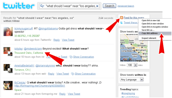 第一步:登入search.twitter.com点击advanced serach,开始搜索在twitter中人们搜索关于“clothing”时最惯于使用的字词和短语,下面的例子展示的就是当消费者搜索“what should I wear” within 100 miles of Los Angeles, CA.时显示的结果。