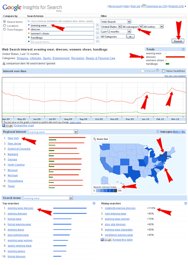 将你的关键词列表提交到google insights for search工具中,你就能比较在不同模式下该关键词的参数,地区,内别,时段和内容了。