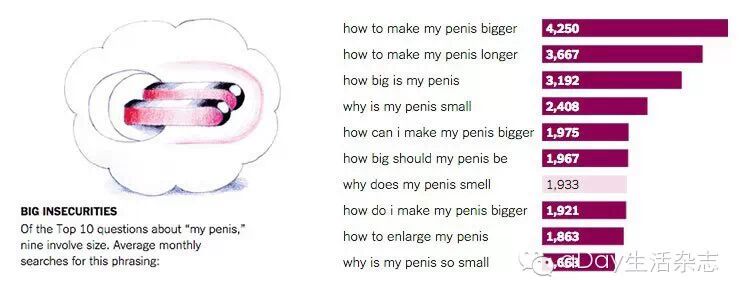 「『疼痛』是Google搜尋上最常與『做愛時____』一起出現的關鍵字。」Stephens-Davidowitz 表示。雖然不太可能因為陰莖過大讓女性陷入窒息危險,但顯然尺寸太大也會影響女性享受性愛的程度。(還記得Sex and the City 裡 Samantha 就曾說過他遇見一個Too big to handle的男人嗎?最後竟然讓性愛女神 Samantha 舉手投降。 )