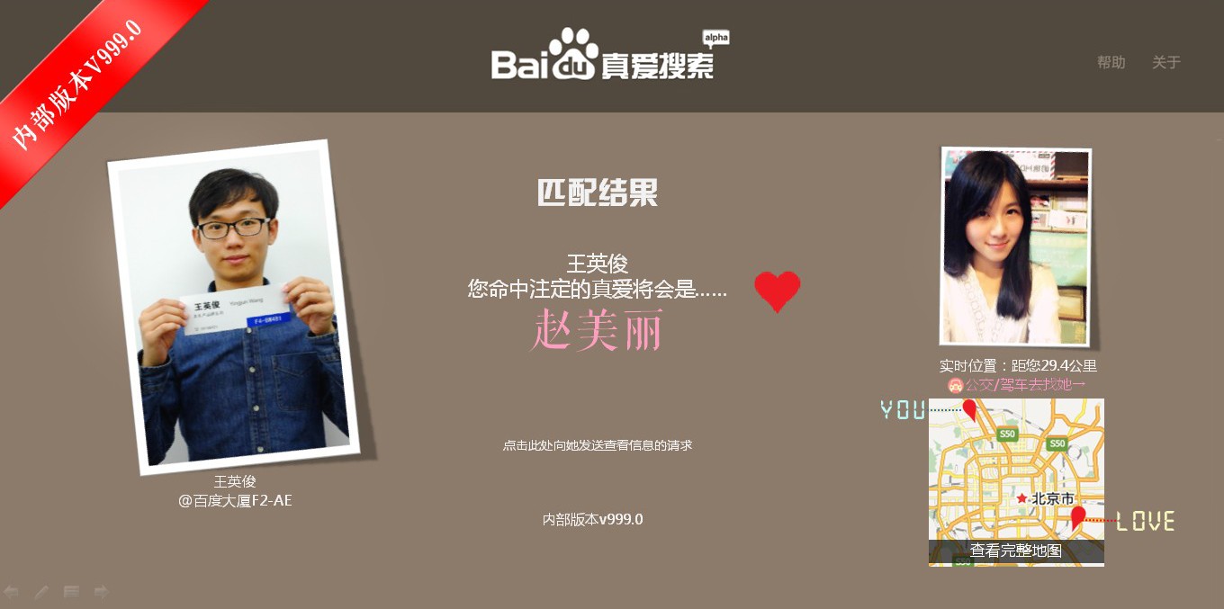 想象一下,百度在未来利用大数据预测、PC搜索技术、地图定位技术、深度学习技术等众多优势技术,帮人们最平等便捷地找到命中注定、一见钟情、性格互补、基因匹配、五行相生、属相相合、志趣相投的一生所爱,简直要酷到没朋友了!