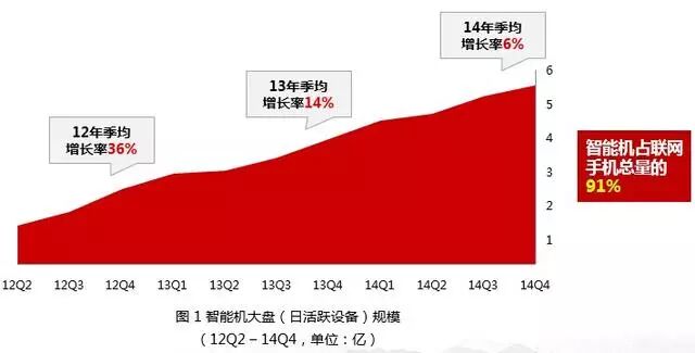国内智能手机普及率不断提升所带来的人口红利为移动互联网行业飞速发展提供基础的土壤,不过百度移动趋势报告显示,2014年国内智能机大盘增速已明显放缓,季均增长率仅为6%,而这一数字在2012年和2013年分别为36%和14%。