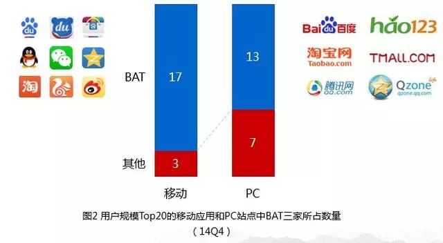 BAT继续在移动互联网时代占据统治地位,甚至优势比PC时代明显。报告显示,在移动端TOP20的APP中,属于BAT的达17个之多,且这些APP在移动端所占据的媒体时长近60%。