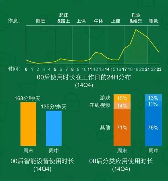 随着智能机普及,00后主要娱乐集中于移动互联网上,00后手机的使用时长大部分在晚间释放,且于周末大增,主要涉及娱乐类应用,包括游戏、在线视频等。