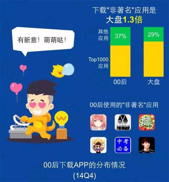 除智能机以外,00后用户更喜欢尝试新鲜、长尾应用,下载该类应用是大盘的1.3倍。