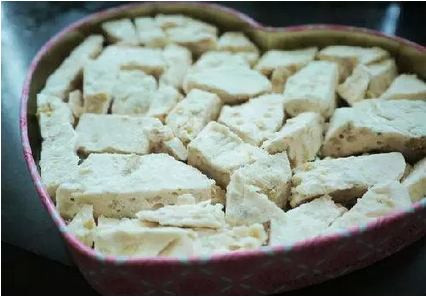 4.用保鲜袋将搅拌好的料装好、压实,装保鲜盒里再冷藏二小时以上,取出扒去袋子,切块就行