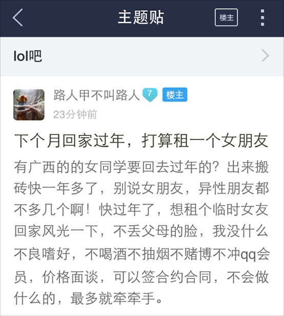 实在找不到,暂时租个女朋友或者男朋友回(meng)家(hun)过(guo)年(guan)也不失为一个救急的办法。打开手机百度搜一搜,嚯,有这需求的同学还真不少!