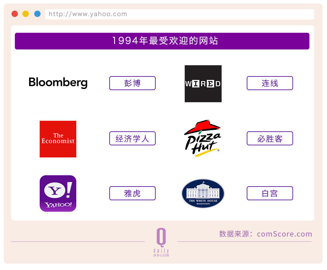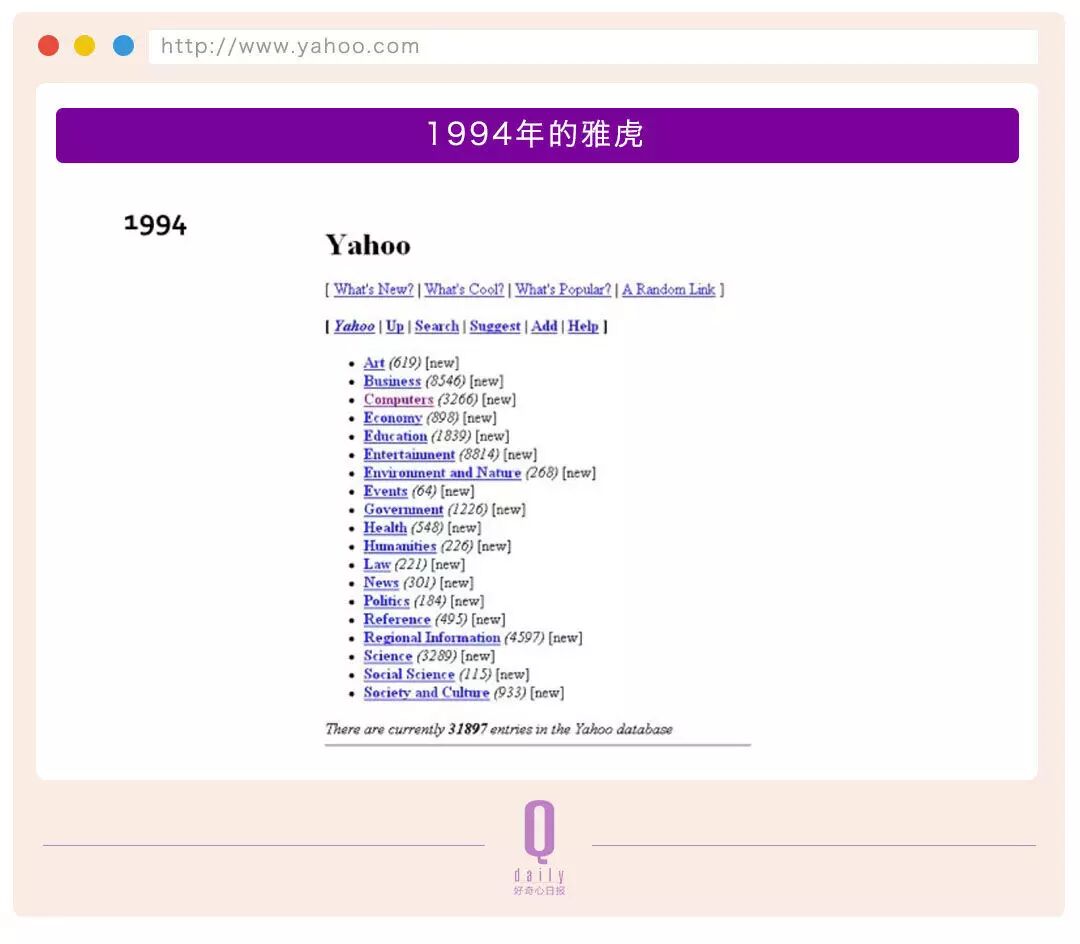 这是 1994 年的雅虎,一个搜索引擎。在当时贫乏的互联网世界,雅虎迅速成为最受欢迎的网站之一。1995 年,《纽约时报》报道 AOL 有意收购当时才创建一年多的雅虎,而雅虎已经开始考虑在网页上展示广告来赚钱。被 Google 推向巅峰的「搜索引擎+广告」模式最早其实是由雅虎发明的。