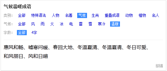 举个栗子,最近气温回升,小搜搜想显摆自己的文采说点什么,搜索一下「成语→气候→温暖」,得出金句:今天真是嘘寒问暖啊