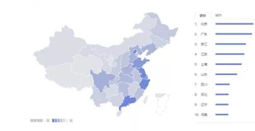 通过百度提供的大数据可以看到,东部沿海以及大中型城市等经济发达地区对于“肺癌”的关注度远远高于中西部欠发达地区,其中,北京、广东、浙江三地民众的关注度分列一二三位。
