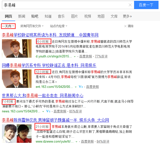举个栗子,如果你是李易峰的脑残粉,迫切地想抢在众多情敌之前知道喋喋一切最新行踪!怎么办?限定搜索一天内的最新消息!