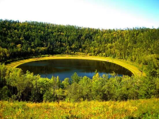 柴河月亮天池坐落在阿尔山的东边,侏罗纪晚期这里曾火山喷发,当年的喷发口如今在这里形成了一个个湖泊,现在的柴河是一个小小的县城,干净的马路和砖瓦的房子使这里显得非常可爱。