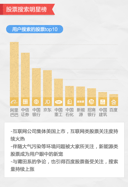 阿里巴巴、中信证券、中国银行、京东、中国重工等10只股票成为大家最为关注的股票。近一年来互联网公司集体美国上市,使得互联网类的股票关注度普遍升高。而伴随大气污染等环境问题被大家认知,新能源类股票也成为用户眼中的新宠。(温馨提示:此处仅为搜索数据解读,大家买股票需谨慎啊~)