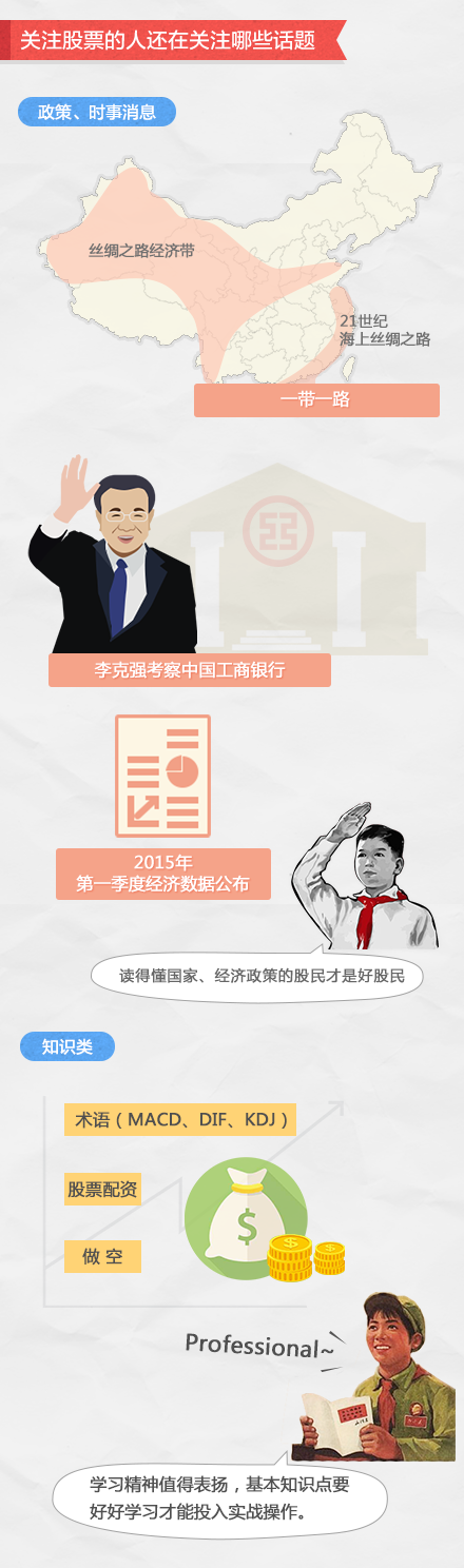 关注股票的人还会关注哪些话题?搜狗大数据统计发现,关注股票的人会关注股票基本理论,同时也会关注政策、实事消息,懂得国家政策和才是炒股的王道!