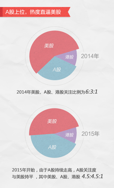 此次中国股市的大牛究竟对股民产生了什么影响?数据统计发现:2014年中国国民关注美股、A股、港股的比例为6:3:1,而2015开年以来,大家更多开始搜索关注A股,截止到日前美股与A股的关注度基本持平,不得不说“大红牛”力大无穷,超越美股就靠你了!
