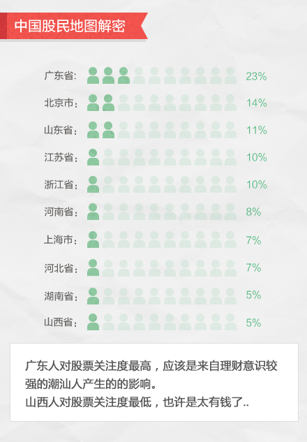 中国股民地图解密:搜狗搜索数据统计发现,广东人对于股票的搜索量最高,而山西人对于股票的搜索量最低。也许是潮汕人的理财意识太强?大概大山西人太有钱不屑于股票投资了,地都买了不少了吧?^ ^