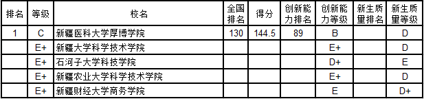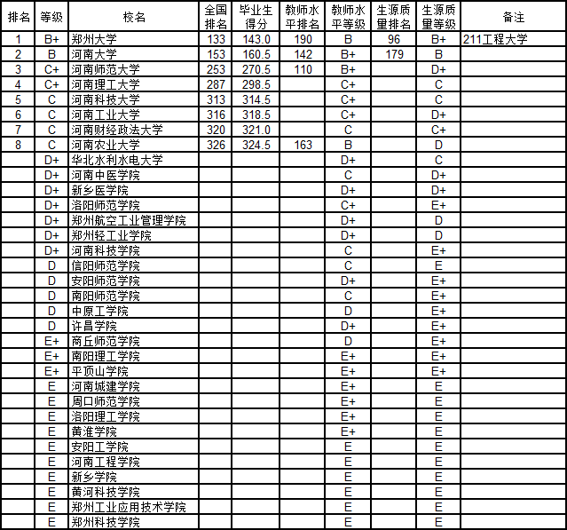 在本排行榜中,本科毕业生质量C级及以上的,列出排名和等级,C级以下的只列等级,不列排名。教师平均学术水平在B级及以上的,列出排名和等级,B级以下的只列等级,不列排名;新生录取分数线(生源质量)在B级及以上的,列出排名和等级,B级以下的只列等级,不列排名。