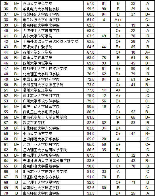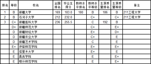 在本排行榜中,毕业生质量C级及以上的,列出排名和等级,C级以下的只列等级,不列排名。教师平均学术水平在B级及以上的,列出排名和等级,B级以下的只列等级,不列排名;新生录取分数线(生源质量)在B级及以上的,列出排名和等级,B级以下的只列等级,不列排名。