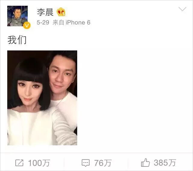 李晨在微博晒出与范冰冰的恩爱合照,范冰冰随即转发,正式承认恋情。