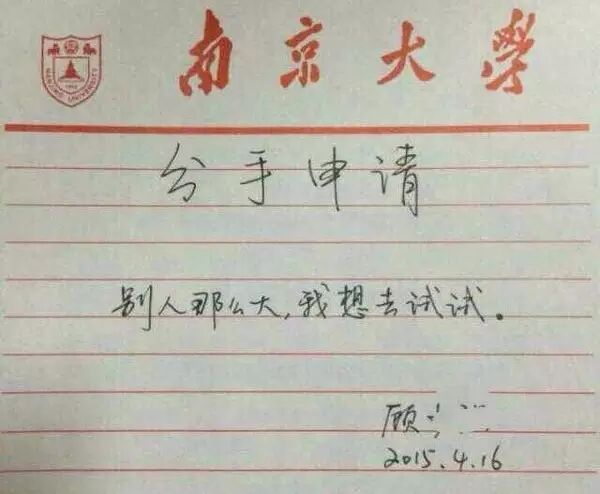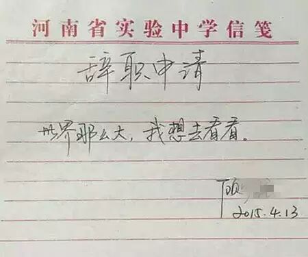 4月,河南省实验中学的一名女心理教师写下史上最具情怀的辞职信:世界那么大,我想去看看。引发网友热评,众多大V、官媒纷纷转发。