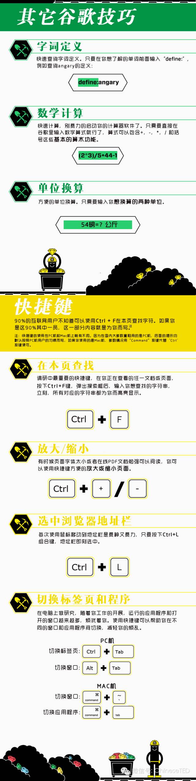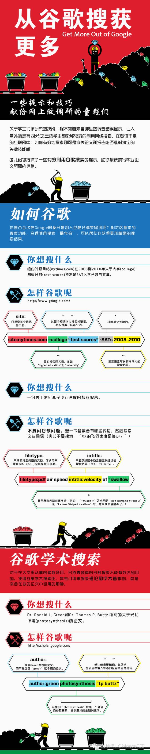 (1)首先要掌握工具,包括熟悉常见的Google语法(如""、site、filetype)和工具(如图片搜索、Google Alert、Google Trends)。关于基本语法,请见附图。