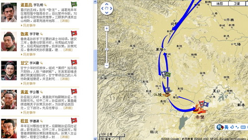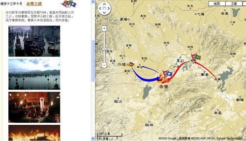 点击左侧的“历史事件”,三国时代的历史便历历在目,点击“赤壁之战”,地图上显示出赤壁之战的路线图,从曹操沿水路向江东进军,到黄盖诈降,再到曹操败走华容道,地图中的路线和电影《赤壁》的剧照将历史重新还原。