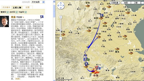 打开赤壁之战地图,左侧有“主要人物”和“历史事件”选项卡,选择主要人物里的“曹操”,可以看到关于他的生平介绍,以及曹操在赤壁之战前后主要事件的地图,可以看到古时的山脉和平原,地图中标注的箭头指出了曹操的几次出征路线,这里有曹操击溃刘备的长阪坡之战的地点,也有曹操赤壁之战之后败走华容道,引军北还的路线。
